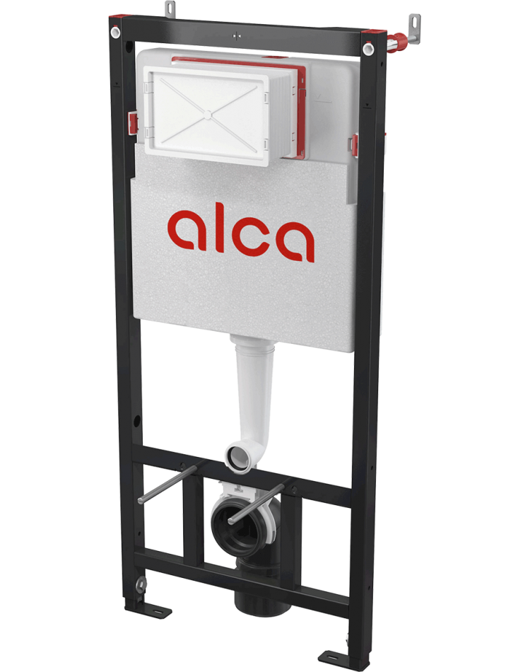 Autoclismo interior com estrutura para sanita suspensa da ALCAPLAST, com revestimento anti-condensação, estrutura metálica resistente à corrosão e indicada para paredes alvenaria.