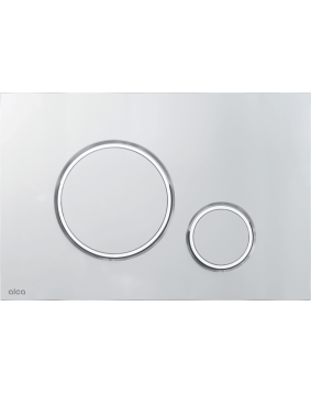 Placa da ALCAPLAST com estrutura e comandos em plástico para dupla descarga de sanitas suspensas.