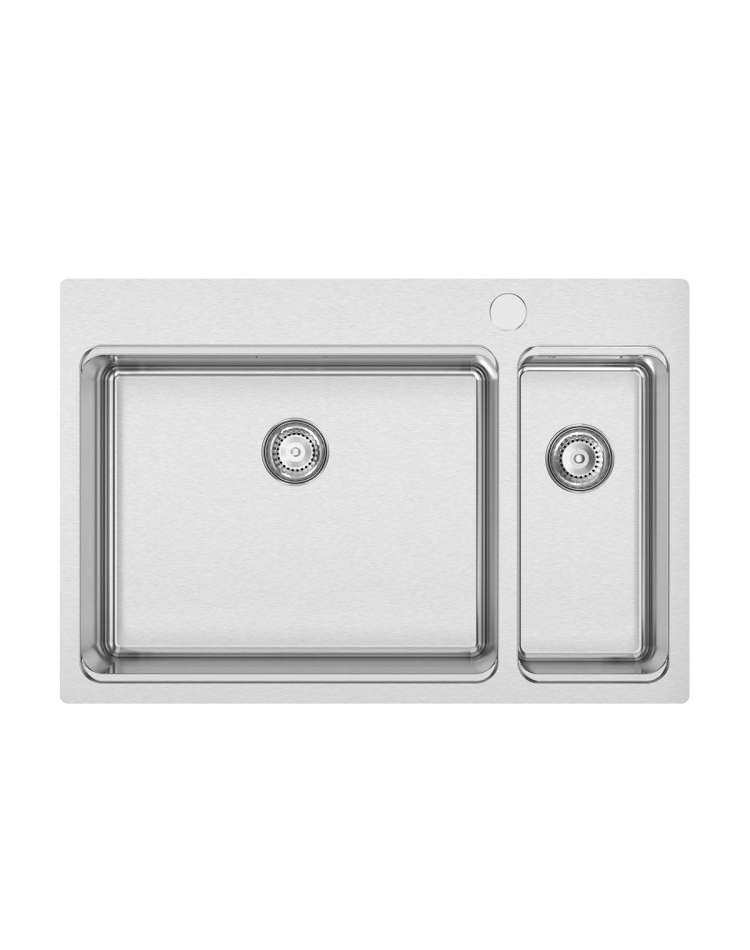 Cuba e meia RODI de raio 25mm, estampada a quente. O degrau integrado para utilização de acessórios no seu interior e a válvula estampada, conferem-lhe elegância e funcionalidade. Inclui tábua VERSUS, sifão/válvula manual de cesta.