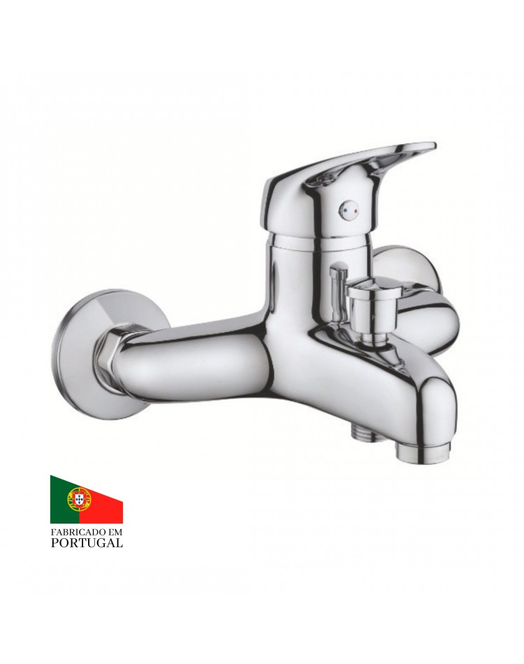 Monocomando para banheira, feito em latão cromado, com acessórios de suporte, ligação e chuveiro de mão. Fabrico Nacional. Garantia de 5 anos.