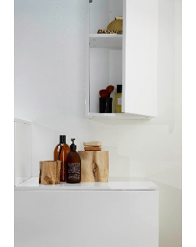 Composta por uma porta com fecho amortecido, uma prateleira fixa e uma prateleira ajustável que proporcionam um espaço de arrumação eficiente para produtos de higiene pessoal.
