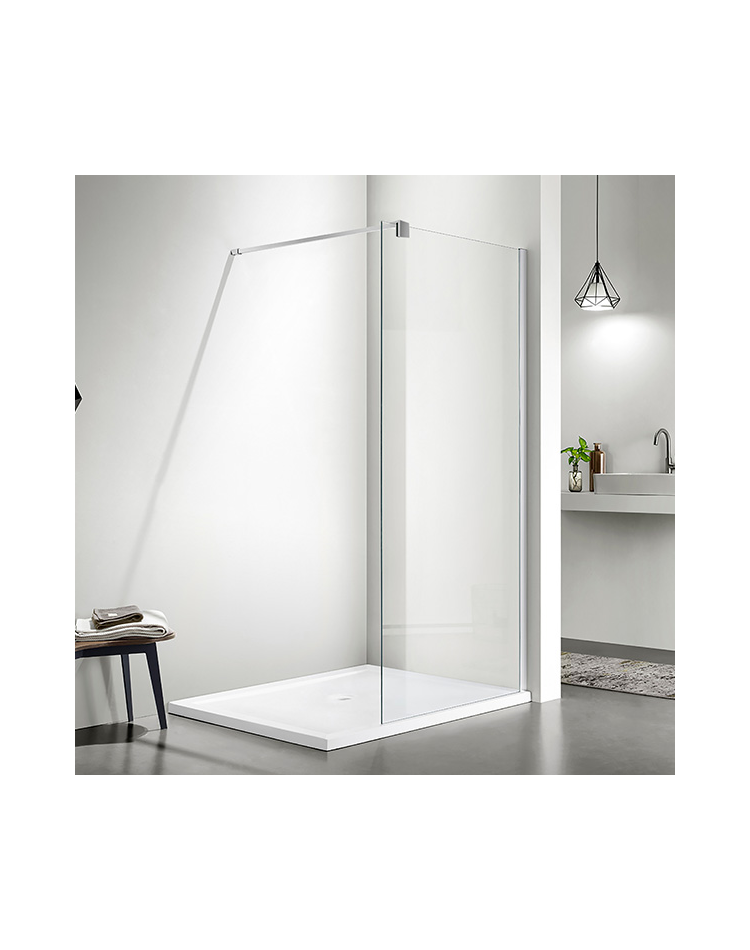 Vidro fixo. Vidro temperado de 8mm. Perfil alumínio cromado. Ajustamento de 25mm. Reversível. Suporte de fixação incluído. Anticalcário.