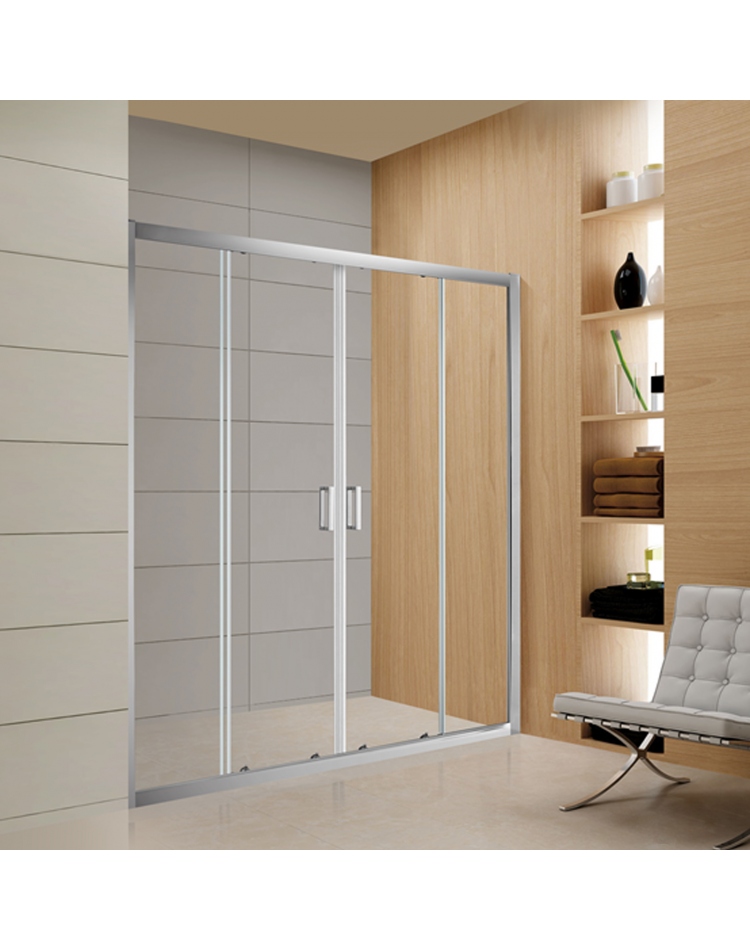 Resguardo de 2 portas de correr e 2 vidros fixos. Vidro temperado de 5mm. Perfil alumínio cromado. Ajustamento de 50mm. Reversível. Puxador cromado.