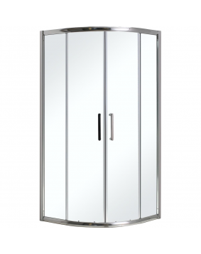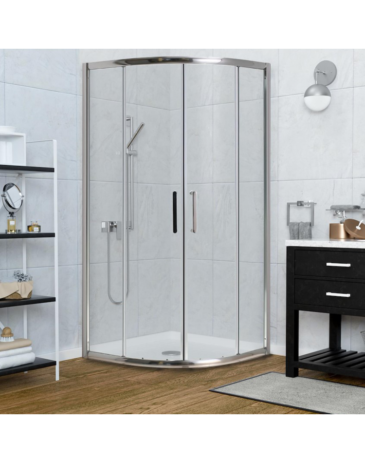 Resguardo de 2 portas de correr e 2 vidros fixos. Vidro temperado de 6mm. Perfil alumínio cromado. Ajustamento de 50mm. Reversível. Puxador cromado. Sem perfil inferior.