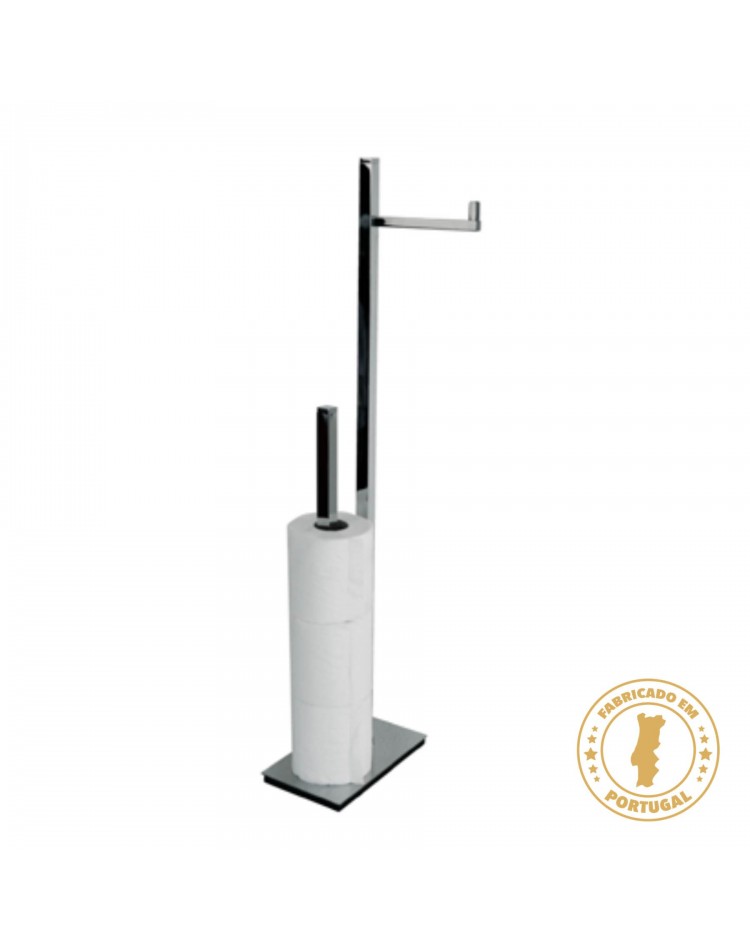 Toalheiro de pé com uma barra quadrada, um suporte para rolo de papel e porta-piaçaba em cromado.
