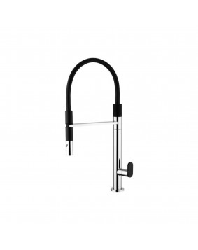 Monocomando para cozinha cromado combinado com bica cinza ou bica preta, com bica flexível e apoiado em suporte.